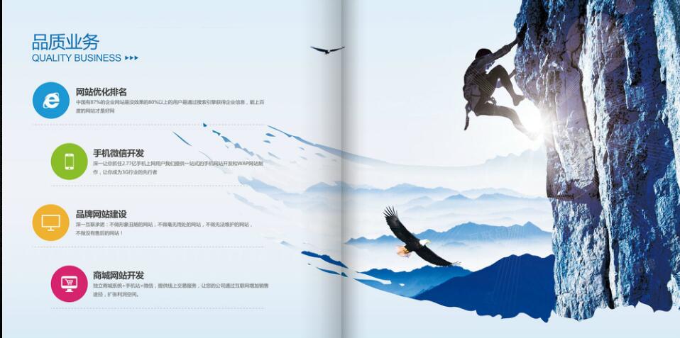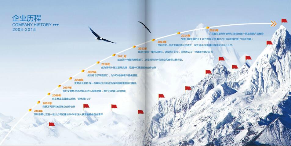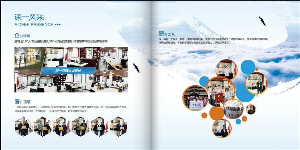 畫冊包含:企業介紹、發展歷程、核心業務、增值服務、經典案例、知名客戶、售后服務等方面內容,涵蓋了深一網站建設等一條龍營銷服務。